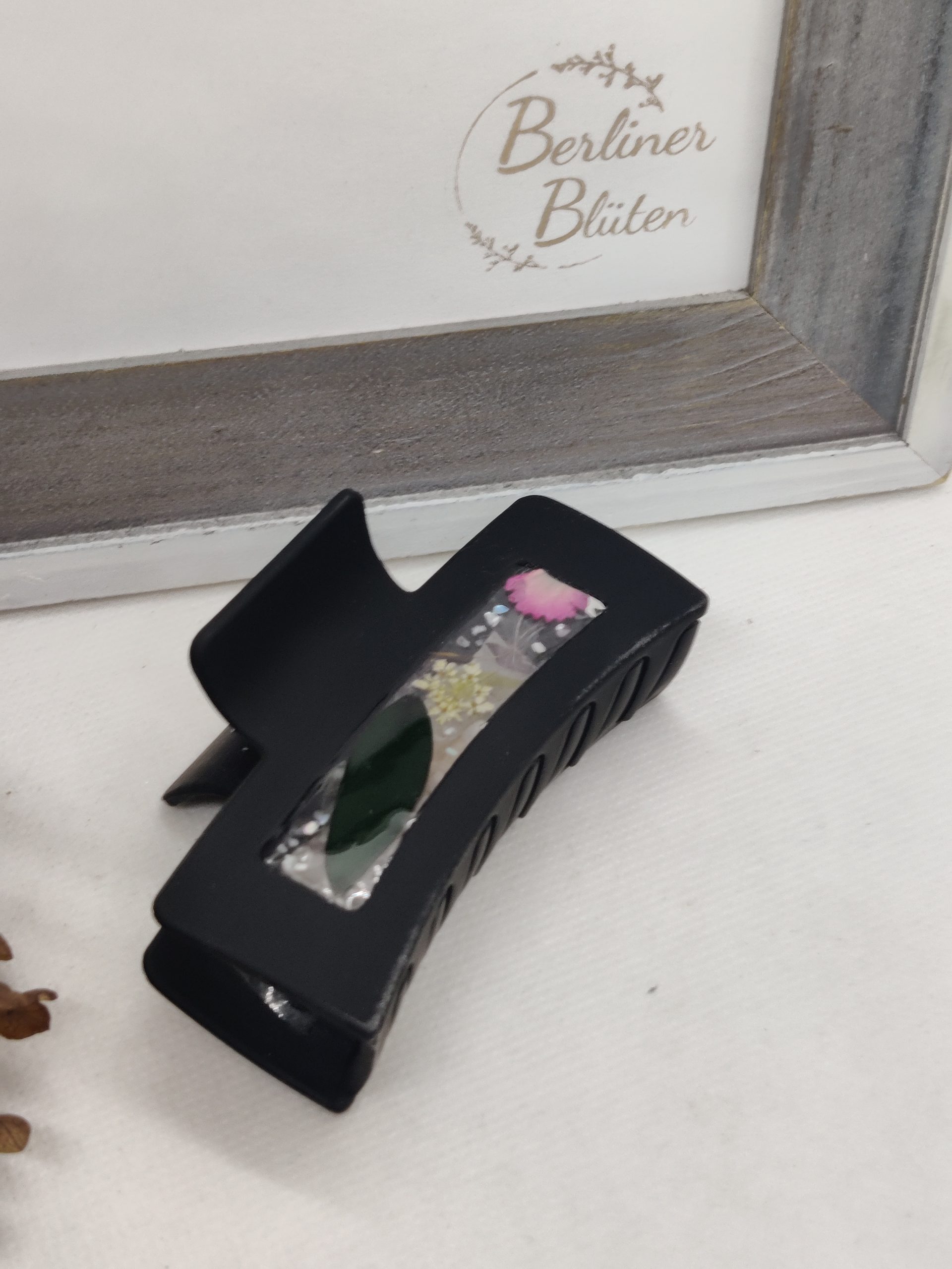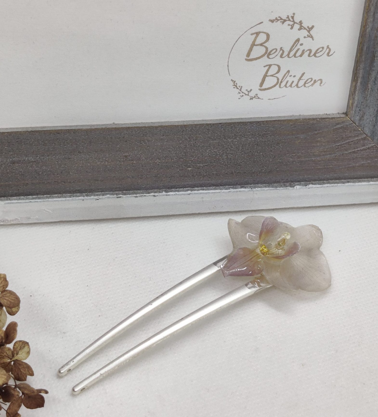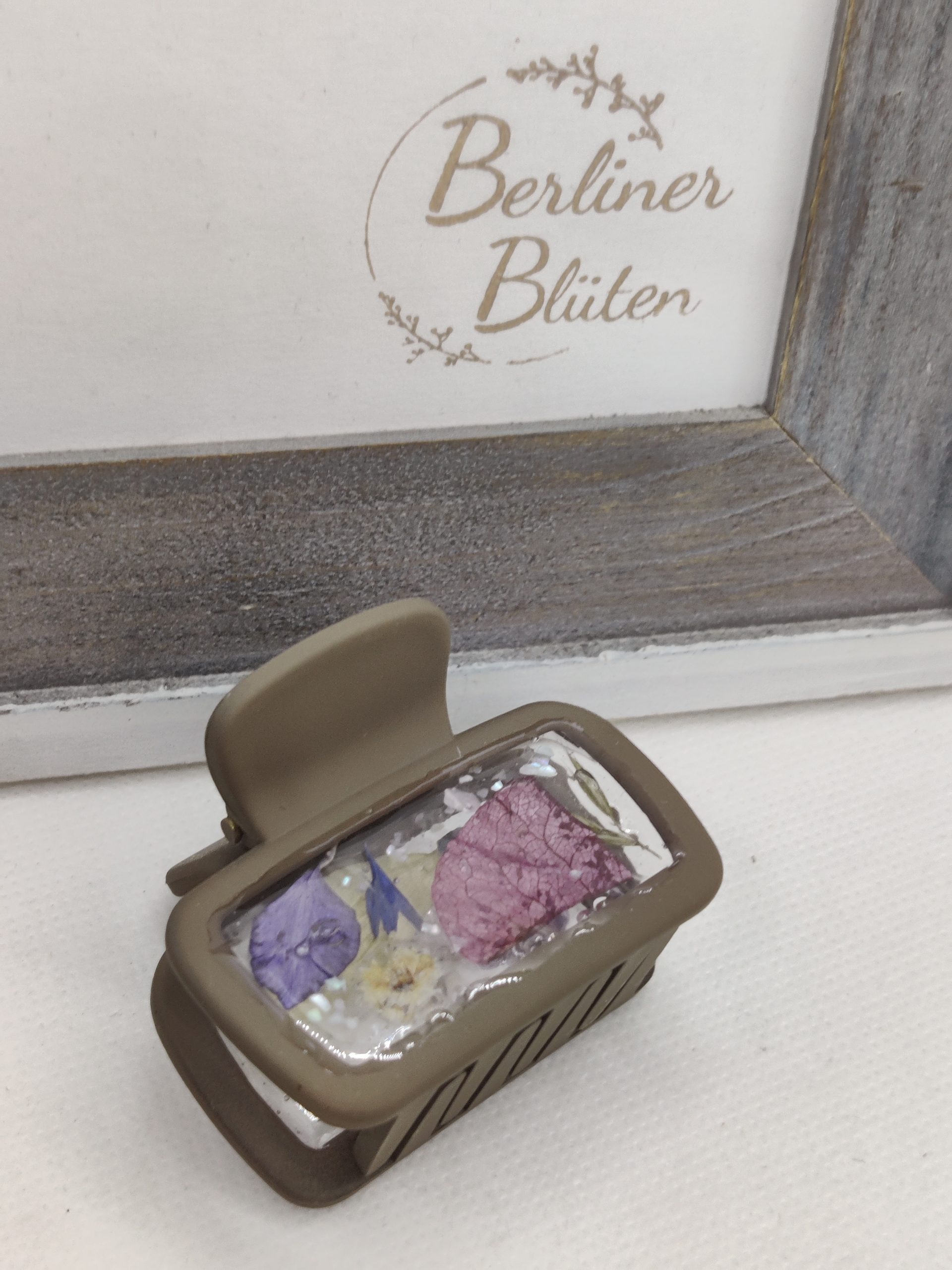Ich habe in liebevoller Handarbeit Haarklammern mit echten Blümchen versehen. Dazu wurden die Blümchen getrocknet und dann in hochwertigem UV-Resin eingegossen.