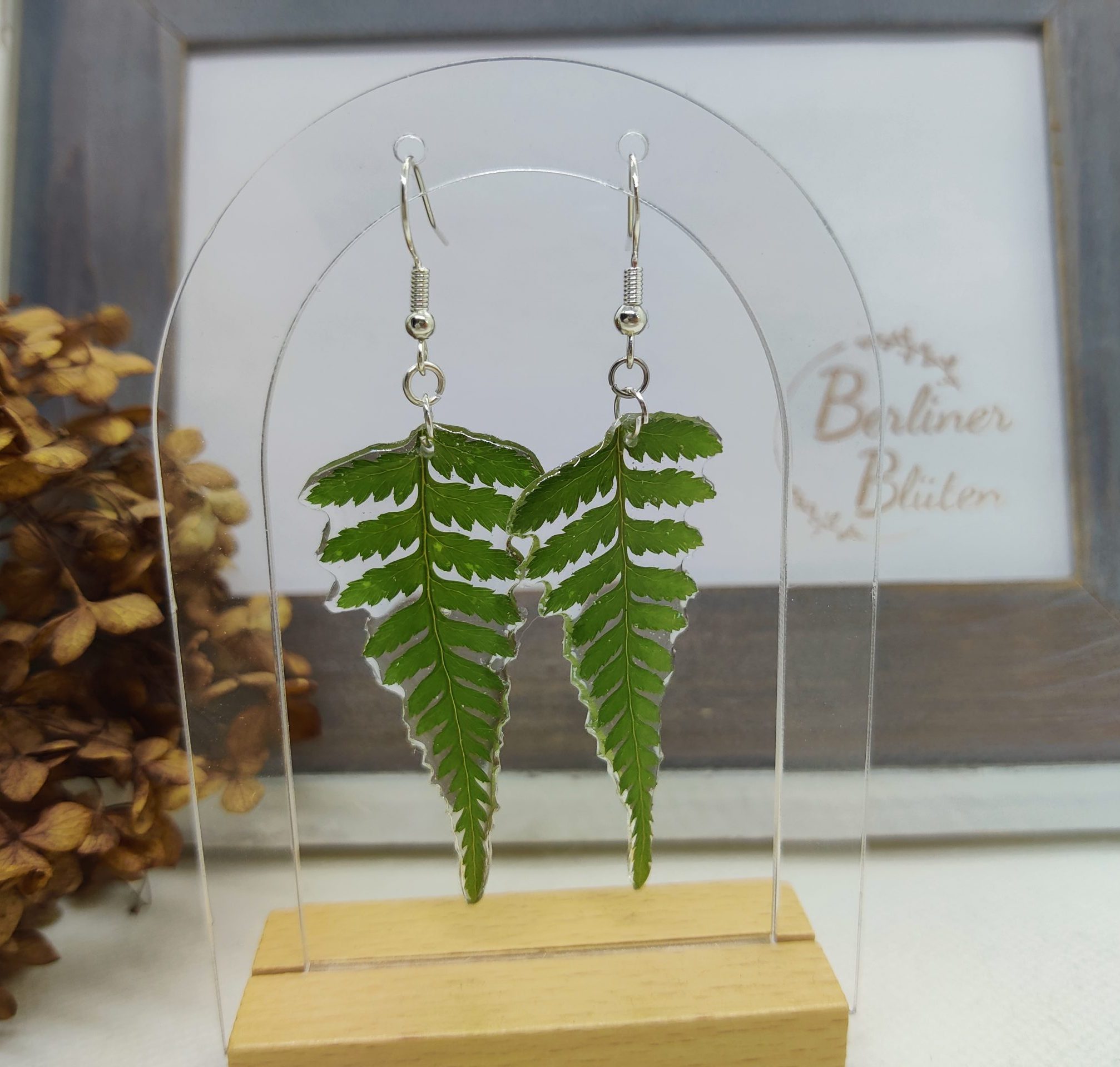 Ich habe in liebevoller Handarbeit dünne Ohrringe aus UV-Epoxidharz / Resin hergestellt. Es wurde echtes Farn getrocknet und dann ins transparentes Resin eingegossen.