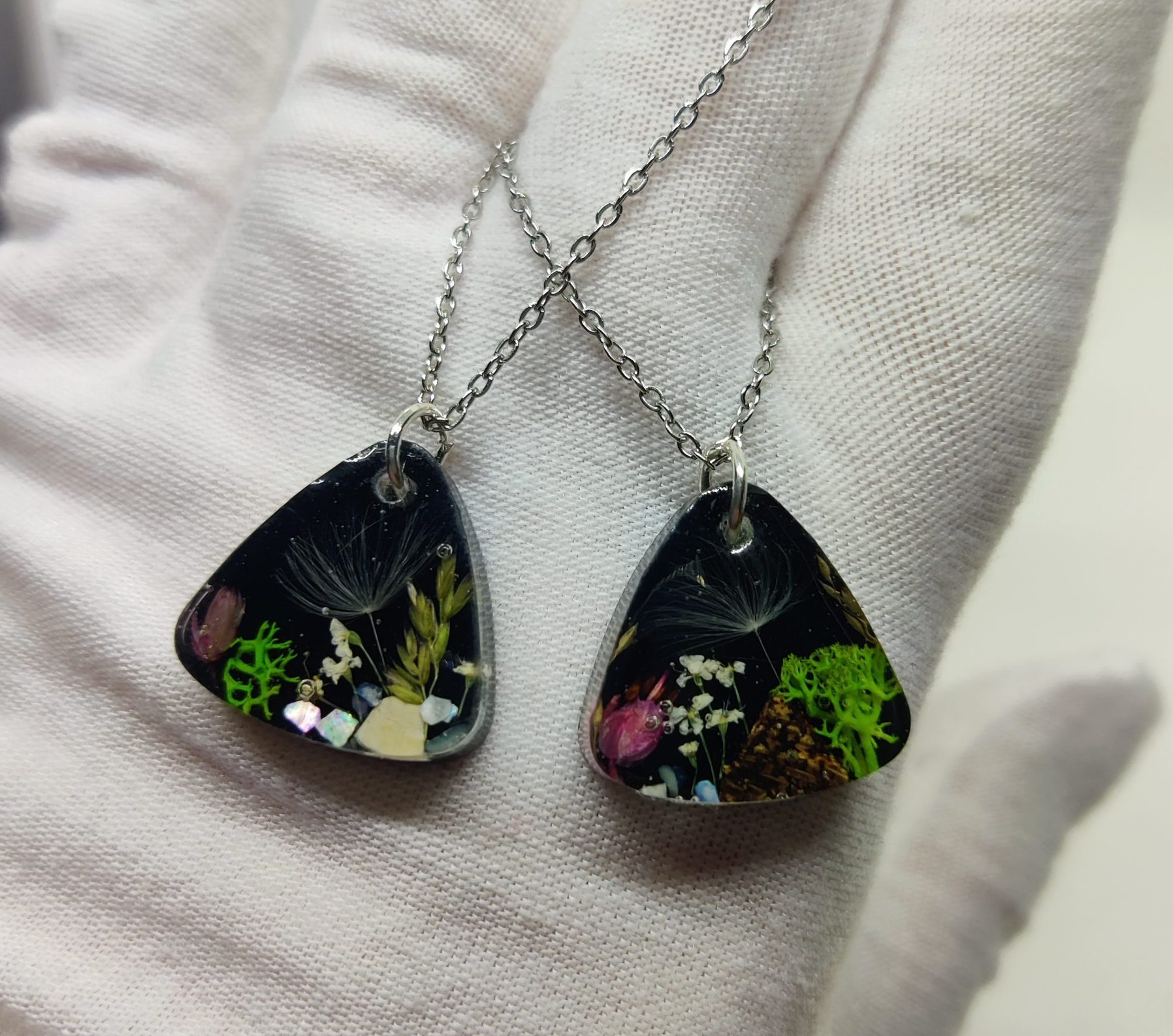Ich habe in liebevoller Handarbeit Ketten aus hochwertigem UV-Epoxidharz / Resin hergestellt. Es wurden kleine Mini Feenlandschaften geschaffen mit echten getrockneten Blüten und Waldfunden (Pusteblume, Blüten, Moos, Gras, Wilde Möhre, Kornblume, Muschelsplitter, usw). Jedes Schmuckstück ist ein Unikat.