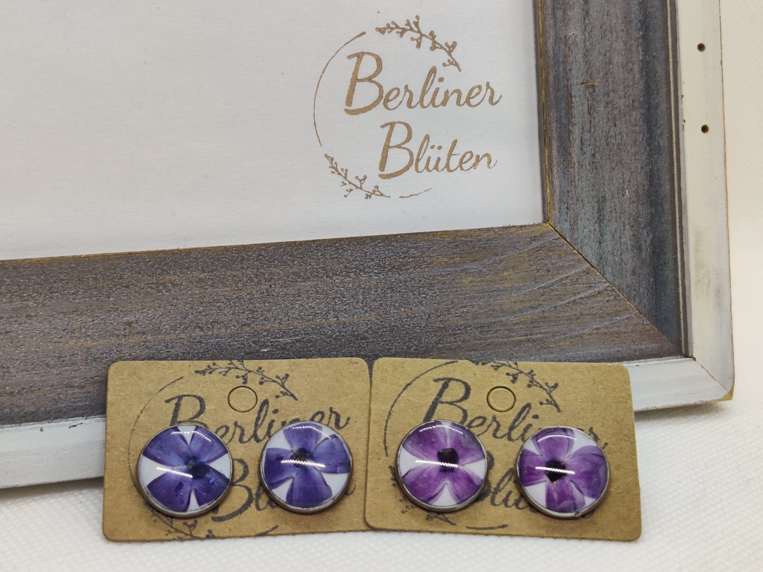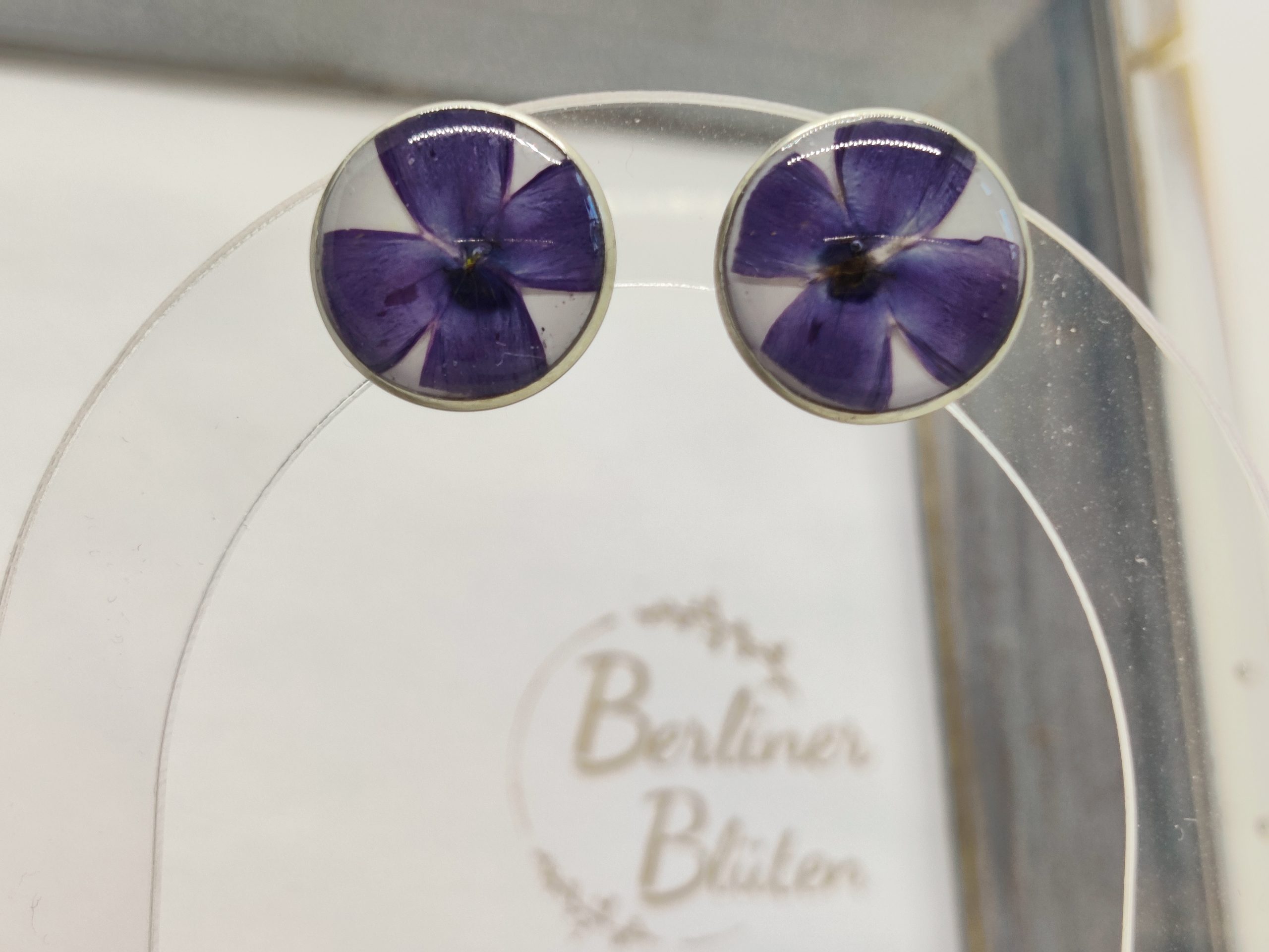 Ich habe in liebevoller Handarbeit Ohrstecker aus hochwertigem Bio-Epoxidharz / Resin hergestellt. Es wurden echte Fliederblüten eingegossen. Der Hintergrund ist weiß.