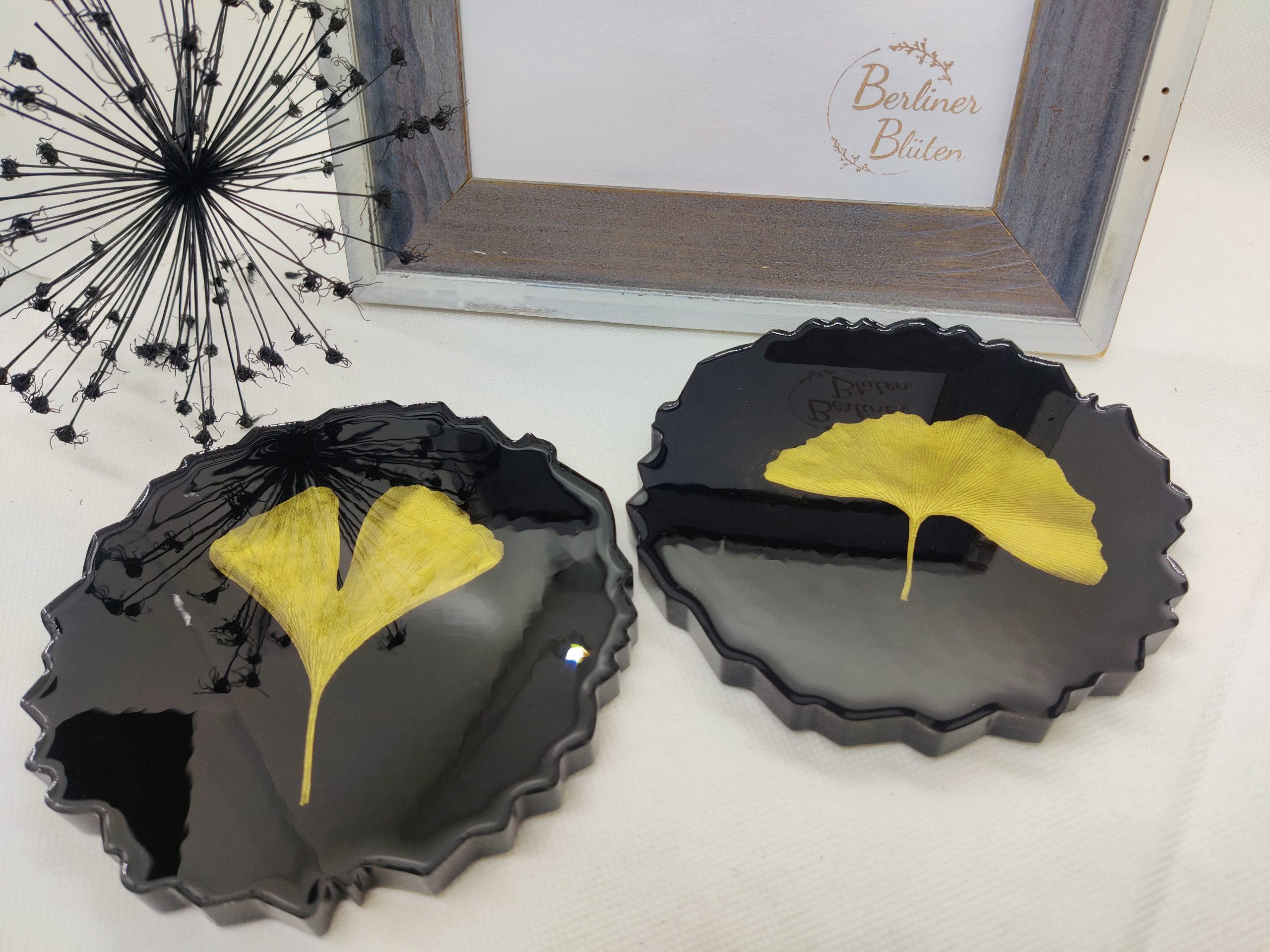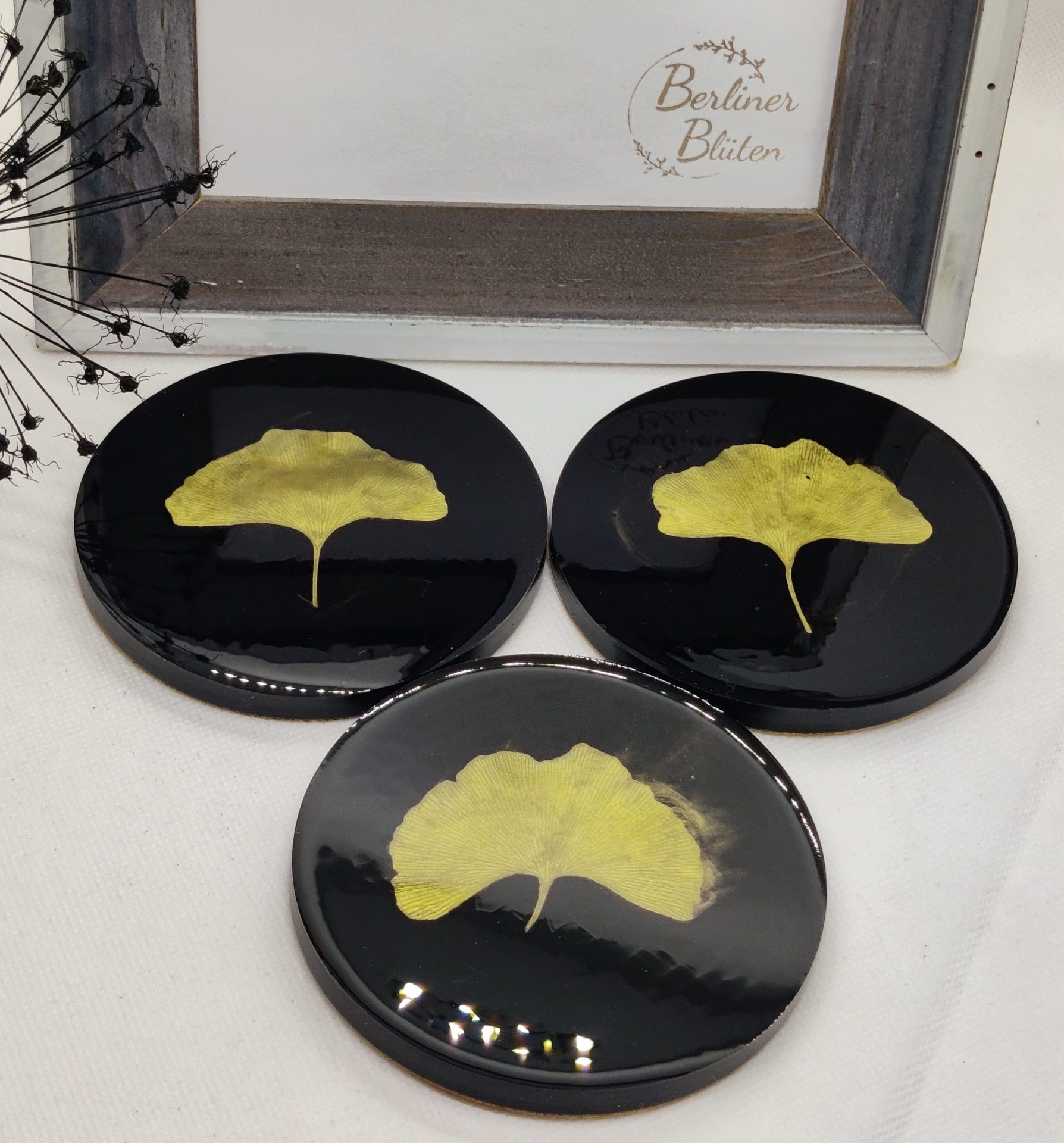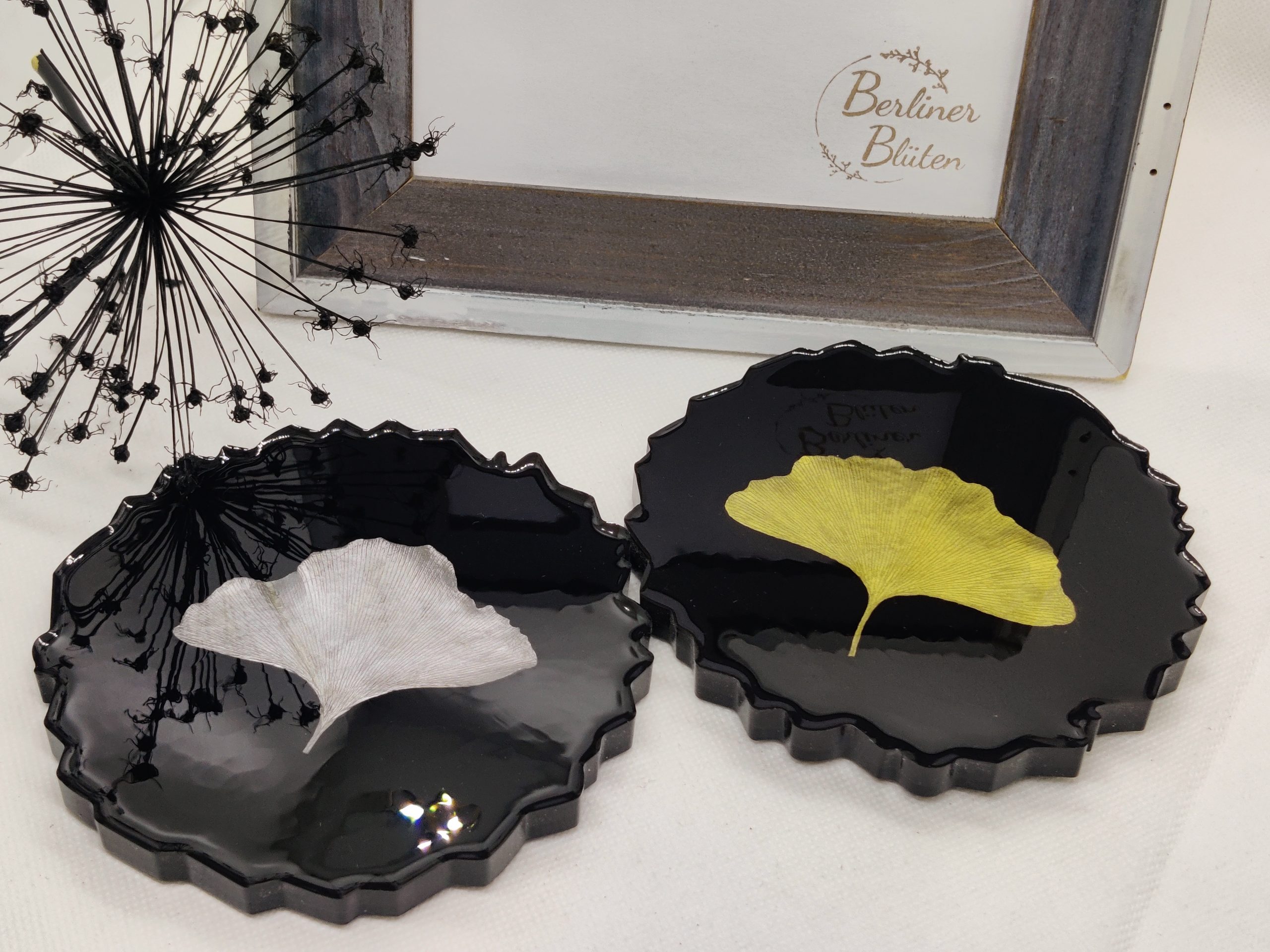 Die Untersetzer haben echte Ginkgo Blätter eingearbeitet. Die Blätter wurden eigenständig gesammelt, gepresst getrocknet und dann lackiert.