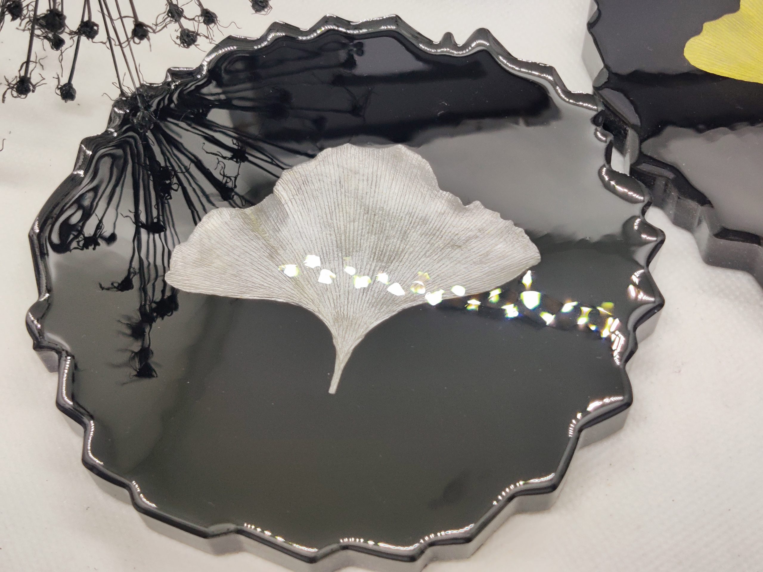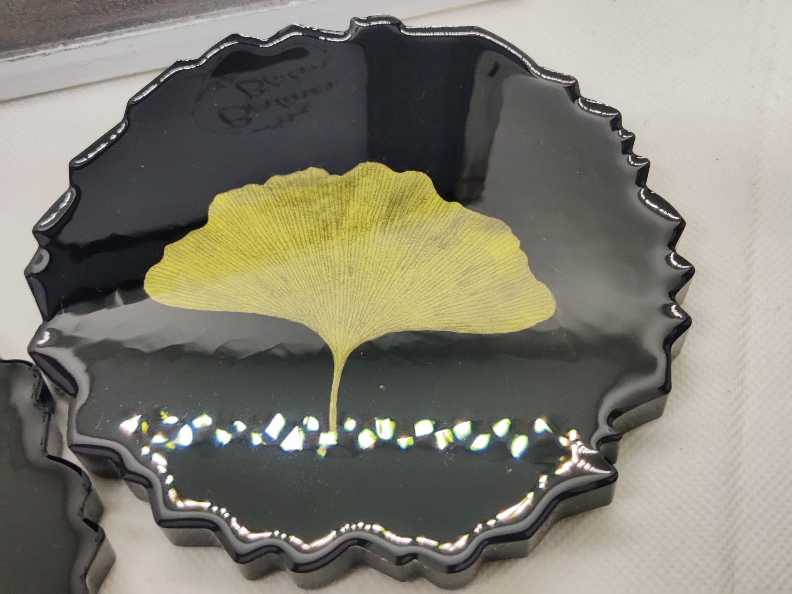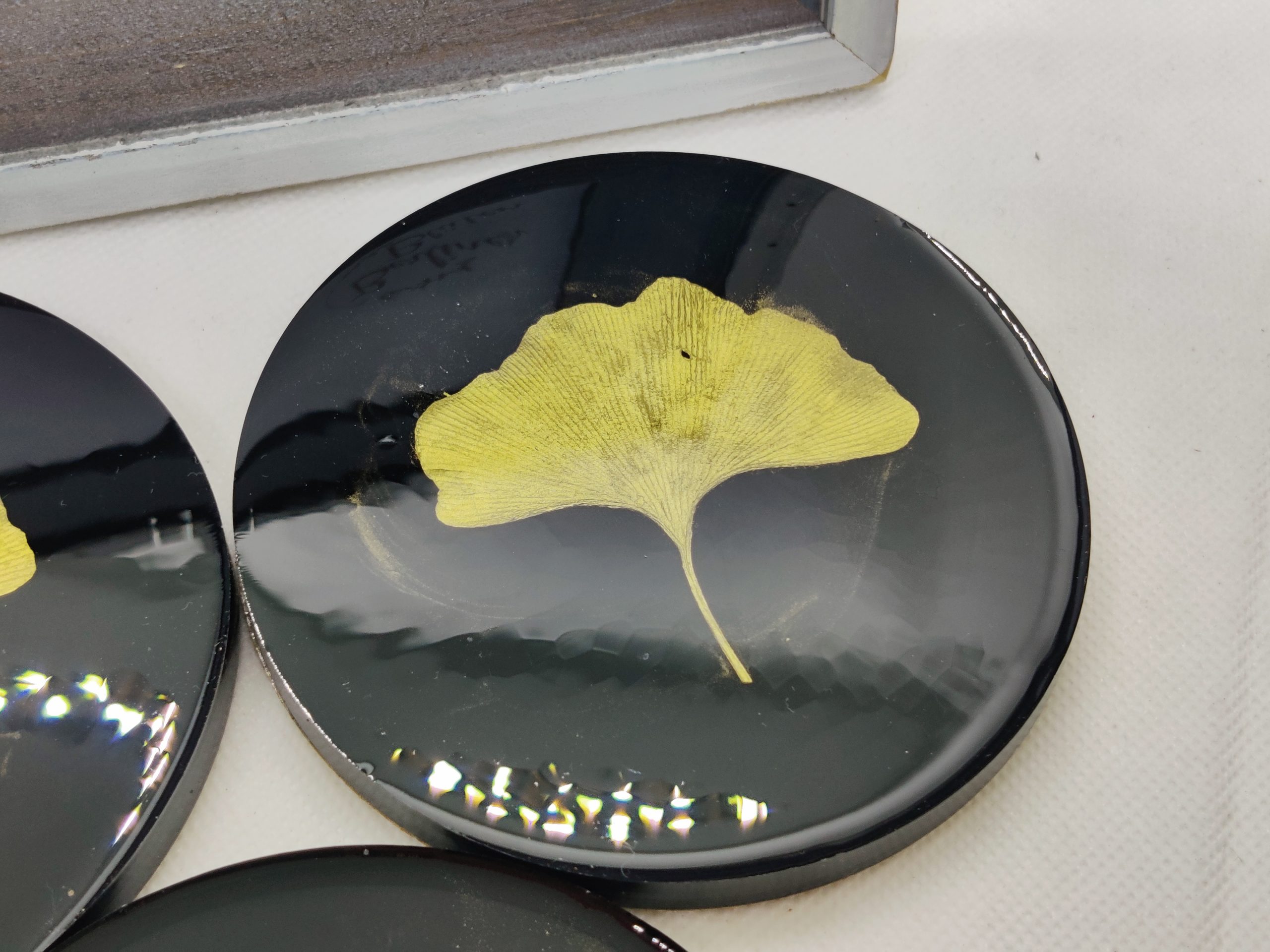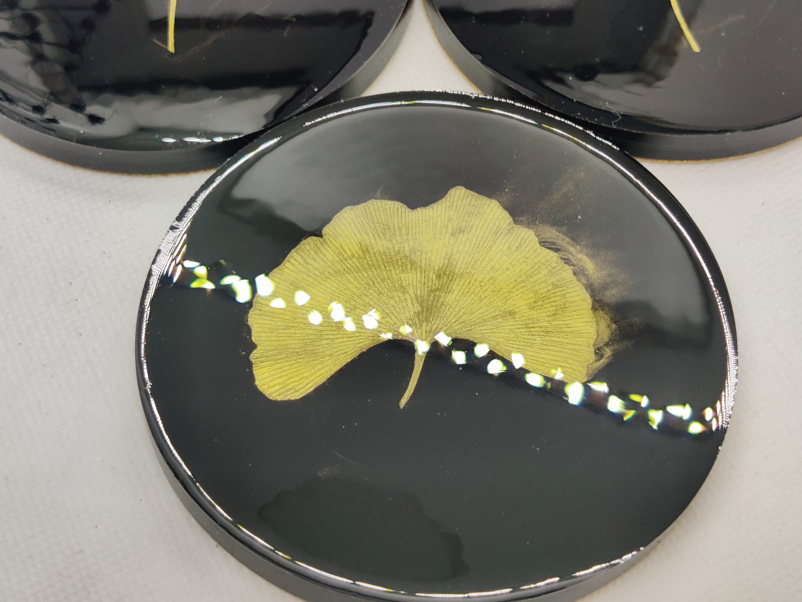 Die Untersetzer haben echte Ginkgo Blätter eingearbeitet. Die Blätter wurden eigenständig gesammelt, gepresst getrocknet und dann lackiert.