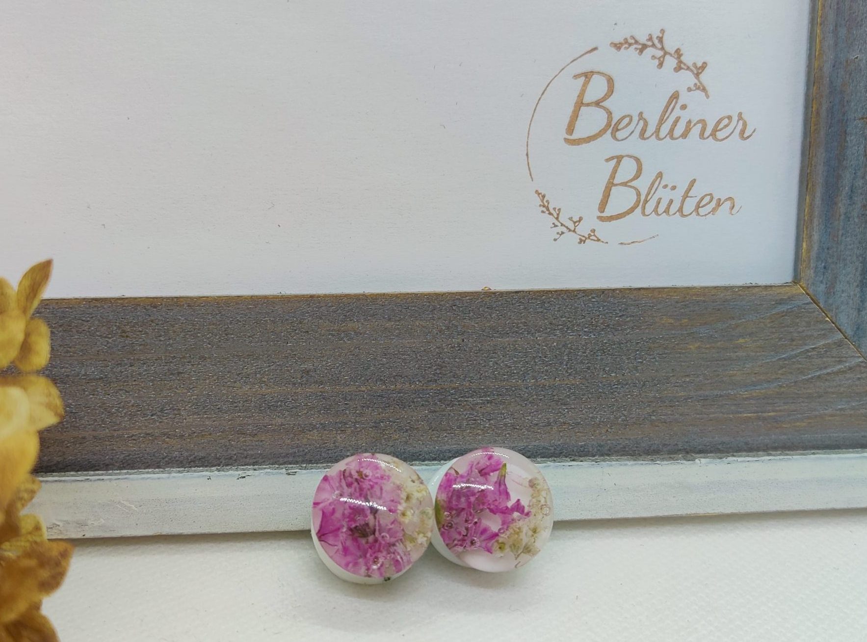 Ich habe in liebevoller Handarbeit Plugs aus hochwertigem Bio-Epoxidharz / Resin hergestellt. Es wurden echte pinke Strandflieder-Blüten und Schleierkraut getrocknet und dann in transparentes Resin eingegossen. Der Hintergrund ist weiß.